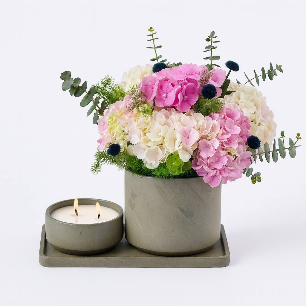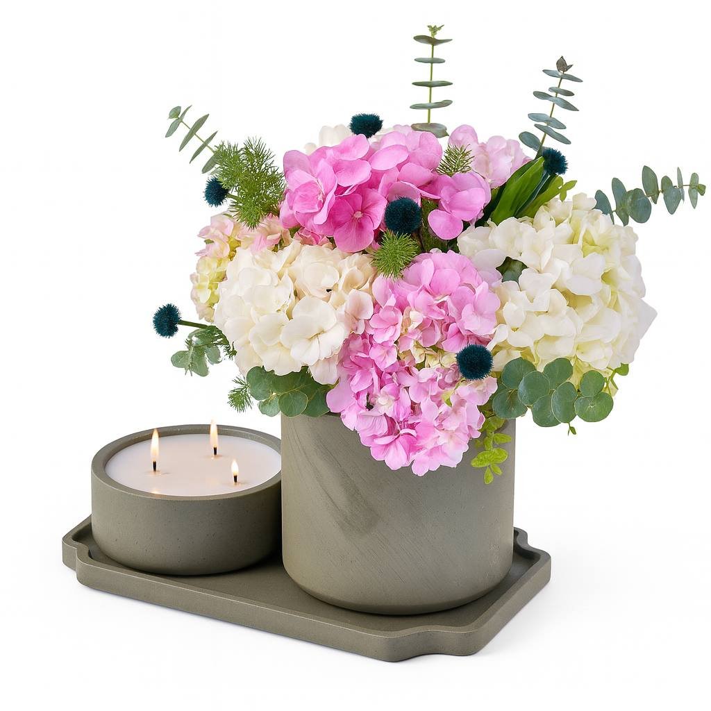 Dekoratif Mumlu Canlı Çiçek, romantik atmosferi ve doğal çiçeklerin tazeliğini bir araya getiren büyüleyici bir tasarımdır. Mum ışığının sıcaklığı ve çiçeklerin canlılığıyla ortamınıza özel bir hava katın.