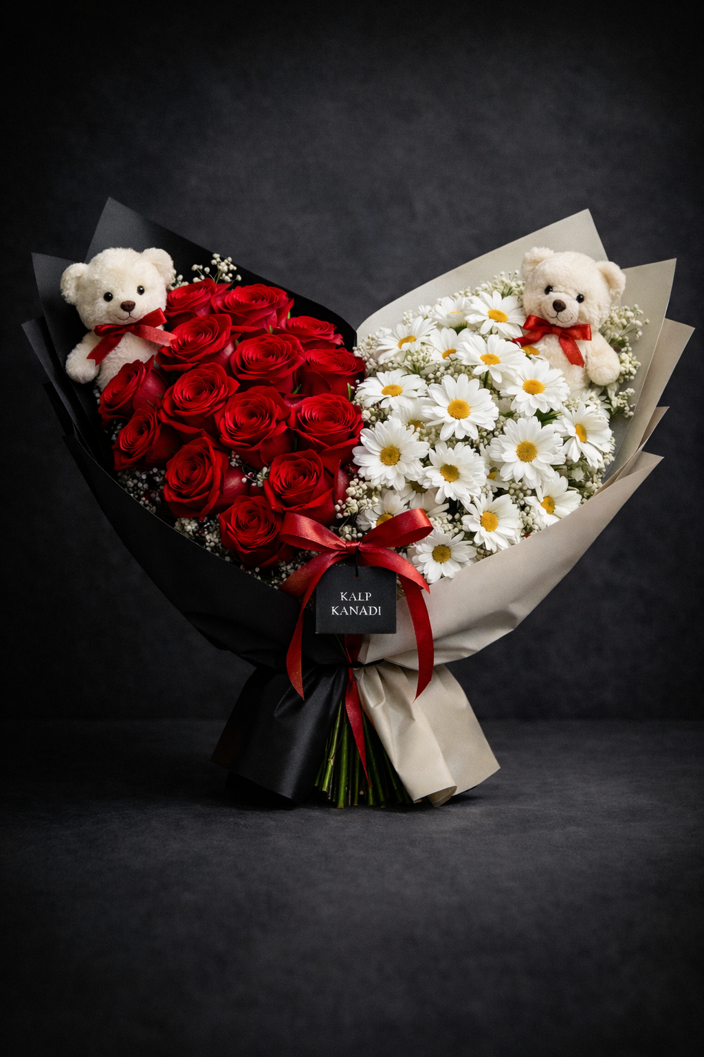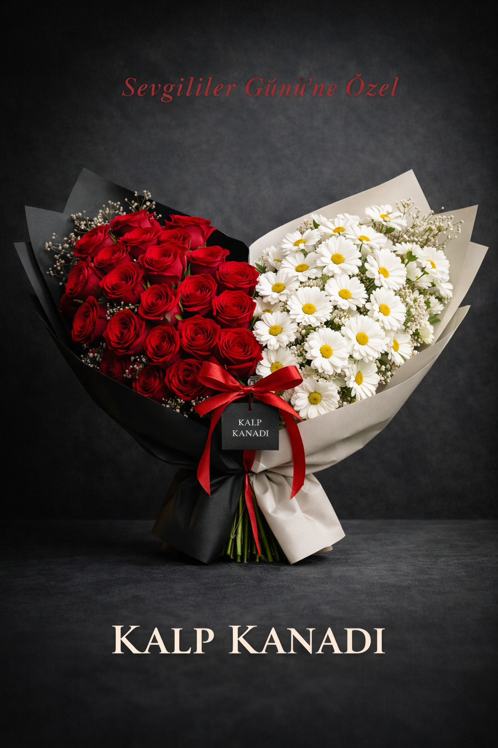 Tutkunun simgesi kırmızı güller ile saflığın ifadesi beyaz papatyalar, kalp kanadı tasarımında bir araya geliyor. Romantik ve zarif duruşuyla duyguları net, temiz ve etkileyici şekilde anlatan özel bir aranjman. 🌹🤍🌼