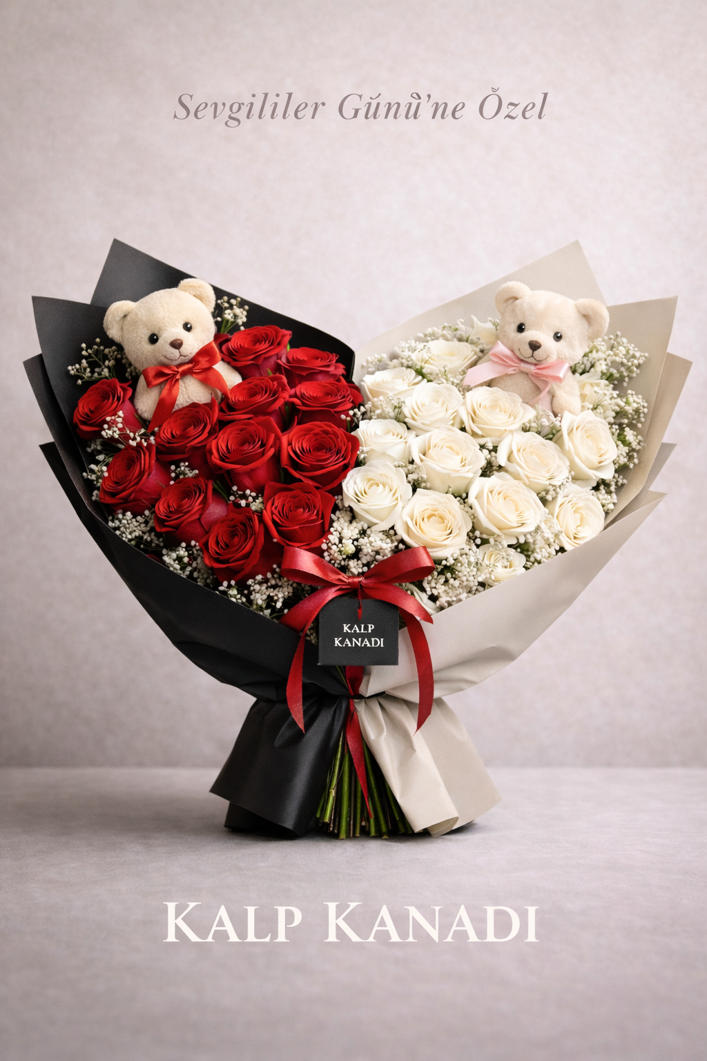 Aşkın tutkusu kırmızı gül ile saflığın simgesi beyaz gül, özel paketleme ve etkileyici kalp kanadı tasarımıyla buluşuyor. Güçlü duyguları tek bakışta anlatan bu özel buket; romantik sürprizler, Sevgililer Günü, yıldönümü ve unutulmaz anlar için tasarlandı.