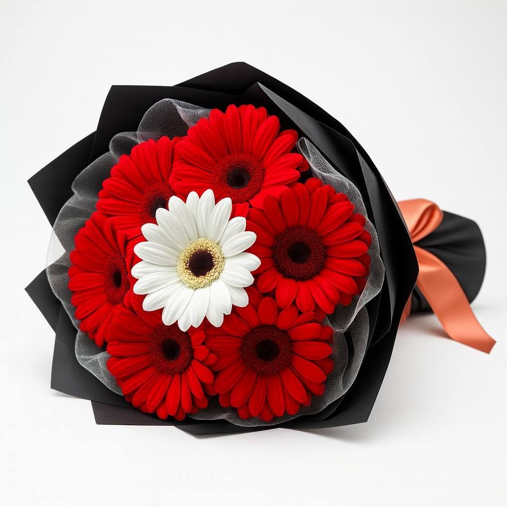 Kırmızı Beyazlı Gerbera Buketi, tutku ve enerjinin rengi kırmızı ile masumiyet ve duruluğun rengi beyazın mükemmel uyumunu yansıtan, özenle hazırlanmış bir çiçek aranjmanıdır. Her biri gerçekçi yaprak dokusu ve canlı renkleriyle dikkat çeken gerbera çiçekleri, bu bukete neşe ve dinamik bir karakter kazandırır. Kırmızı gerberaların coşkulu enerjisi, beyaz gerberaların sakin ve saf etkisiyle birleşerek bulunduğu ortama pozitif bir hava ve denge getirir.