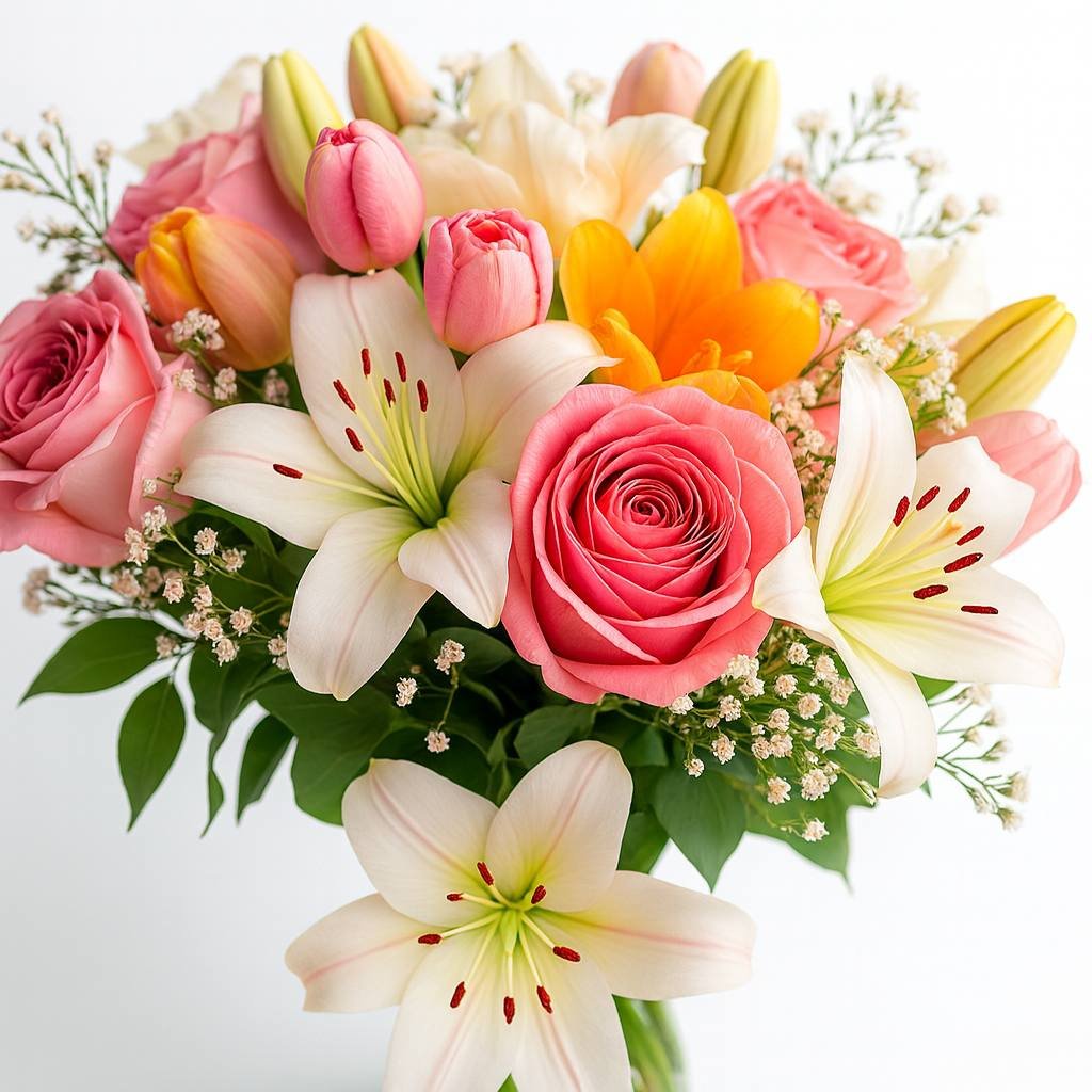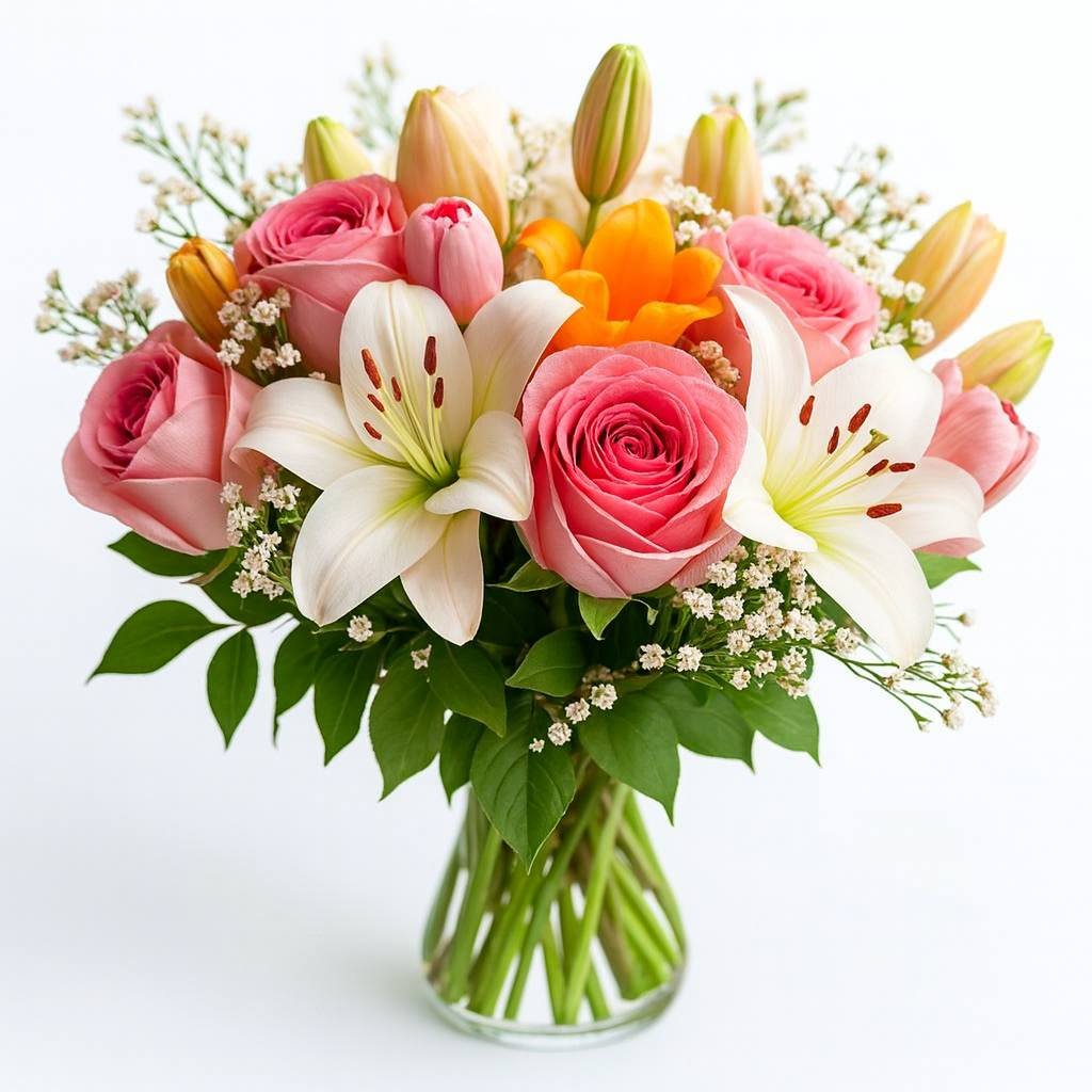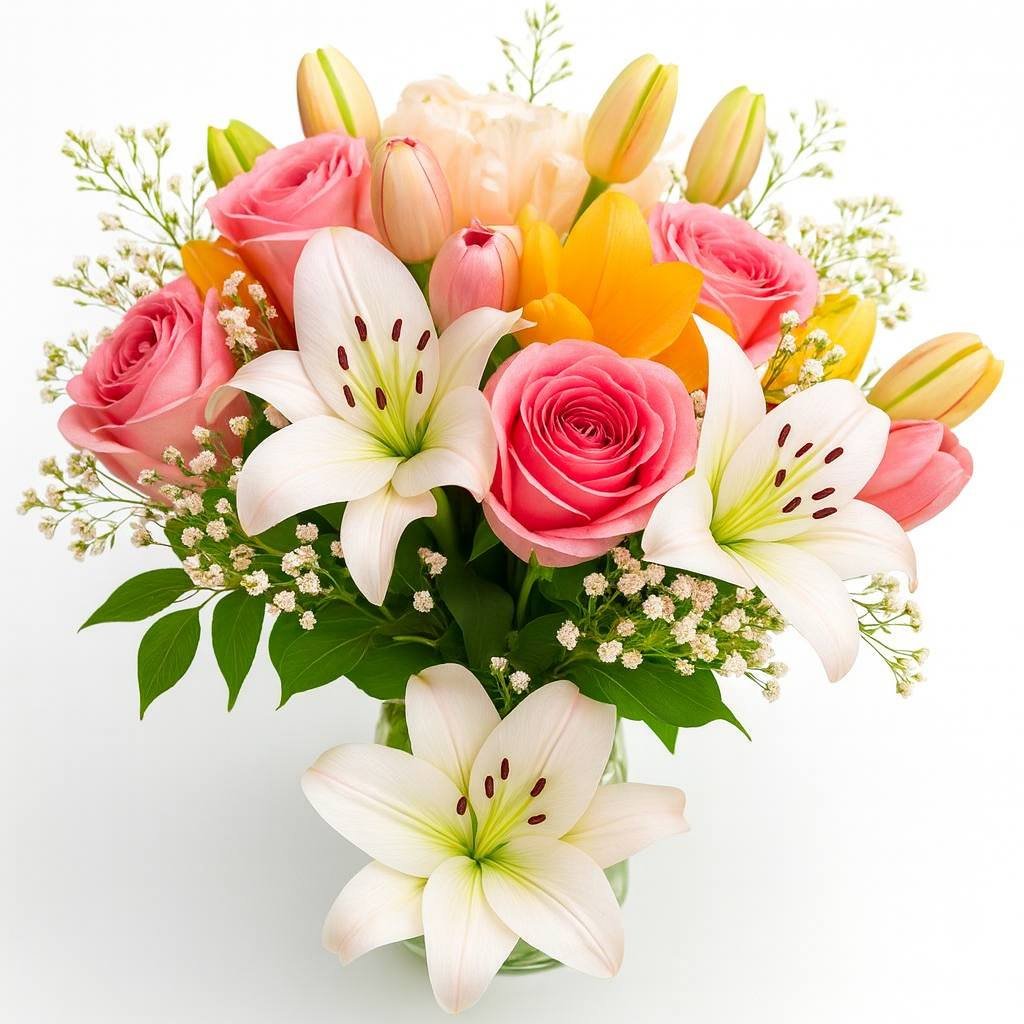 Lilyum Gül Lale Vazosu, zarafet ve lüksün muhteşem buluşması! Özenle hazırlanan vazo aranjmanı, lilyum, gül ve lalelerin büyüsüyle evlerinize ve ofislerinize şıklık katıyor.