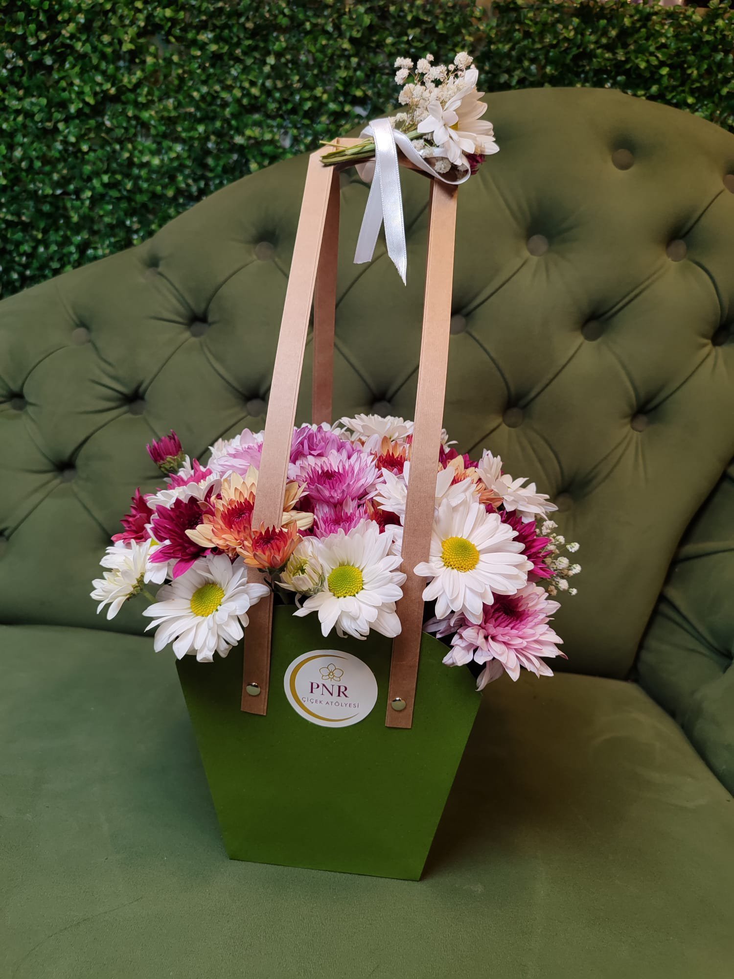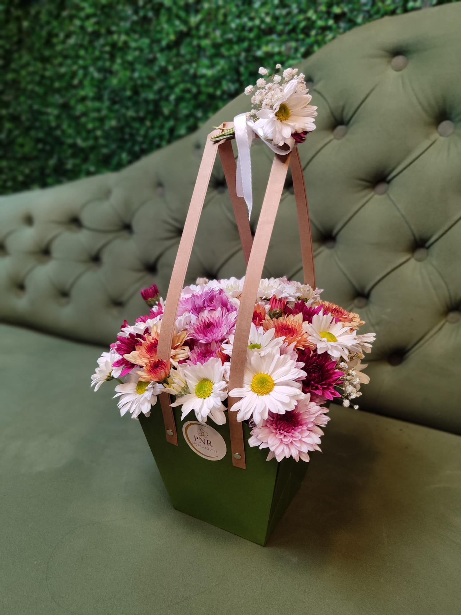 Pembe, turuncu ve kahve tonlarındaki şık çantalar içinde sunulan Papatya Şöleni, rengarenk papatya ve kasımpatıların enerjisini zarif bir tasarımla buluşturur. Canlı renkleriyle mutluluk yayar, doğal görünümüyle her ortama sıcak bir dokunuş katar.