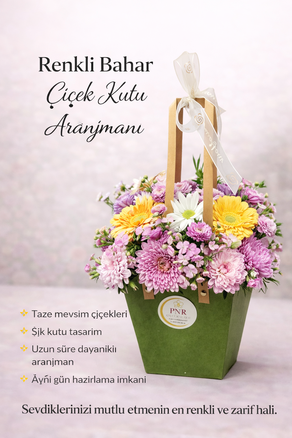 Premium Renkli Buket, lüksün ve yaşam coşkusunun bir kutlamasıdır. Nadide çiçeklerin canlı renk uyumuyla hazırlanan bu buket, özel anlara görkem ve neşe katar. Unutulmaz hediye arayanlar için ideal seçim.